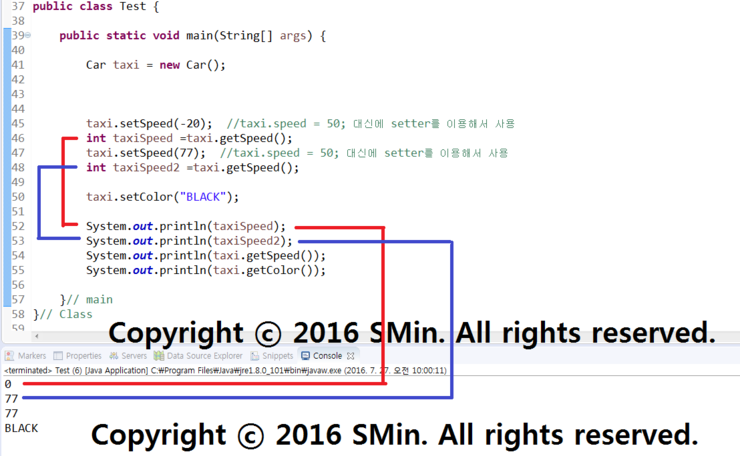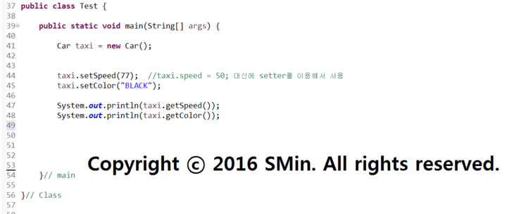 taxi.setSpeed(77); //taxi.speed = 50; 대신에 setter를 이용해서 사용