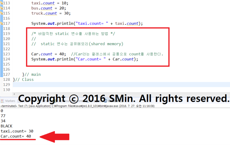 02. 바람직한 Static변수 사용방법은 객체를 만들어서 각각하기보다는 클래스 자체에 변수를 재정의 시키는 것이다.
