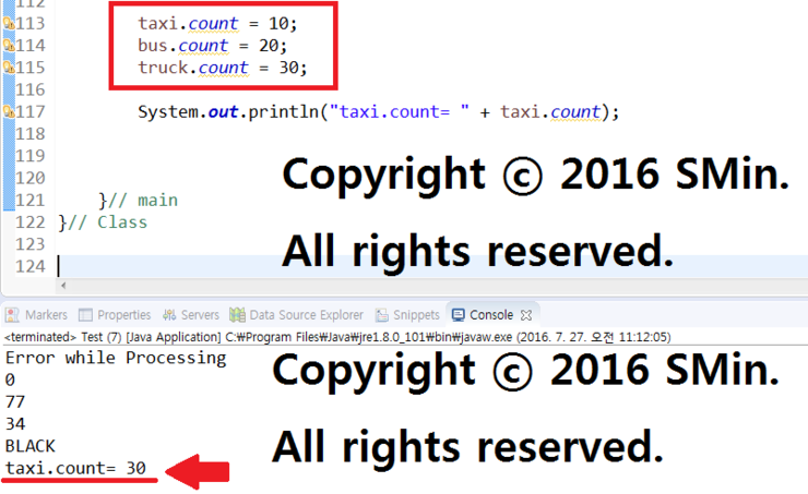01. 메인클래스에서 'taxi', 'bus', 'truck' 객체를 만들고 각각 객체의 count를 재정의 해서 taxi.count를 출력해보면 30으로 출력되는 것을 확인할 수 있다.