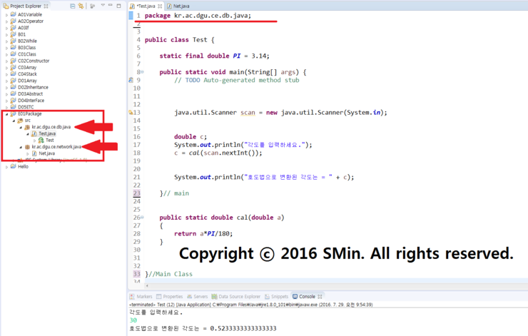 왼쪽트리에서 '마우스오른쪽버튼'클릭-> '페키지이름변경' 혹은 클래스를 만들때 설정해줄 수 있다.