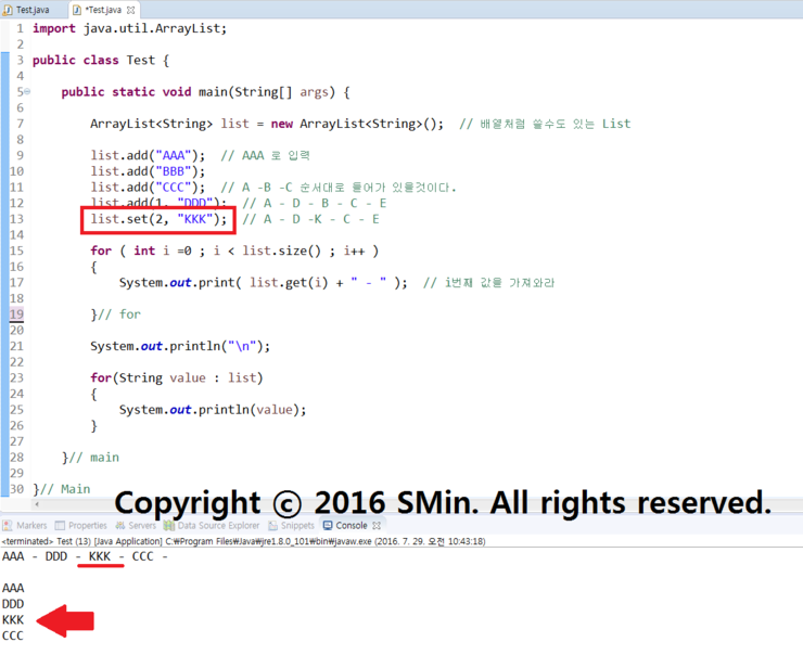 list.set(2, "KKK"); // A - D -K - C