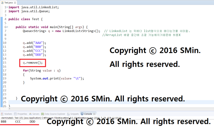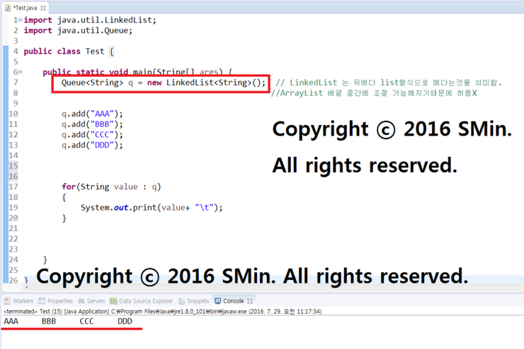 Queue<String> q = new LinkedList<String>(); // LinkedList 는 뒤에다 list형식으로 메다는것을 의미함.
