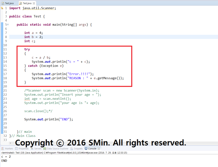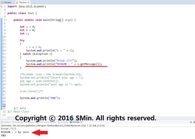 01. 하지만, b값에 0을 두면 에러가 나기때문에 catch쪽으로 넘어가게 된다.