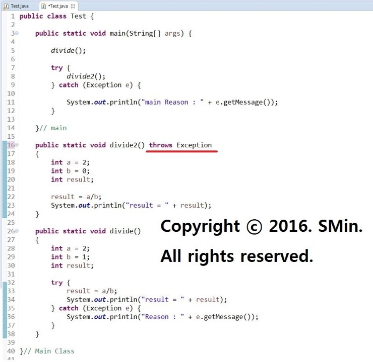 따라서, 'divide2();' 에서 작업을 시킨다음에 그 작업내역을 메인으로 던져서(throw) 메인에서 일(TryCatch)을 할 수 있게 한다.