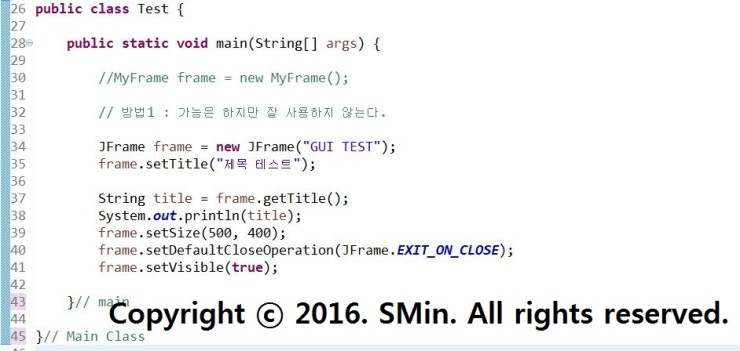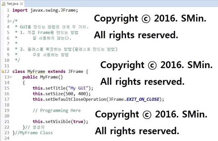 ㅁ. GUI를 시작하는 필수코드이므로 'MyFrame' 클래스를 만들고 앞으로 복사해서 사용하면 됨.
