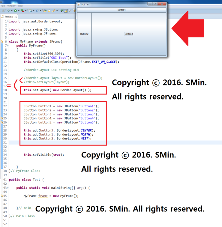 레이아웃 중 보더레이아웃(BorderLayout) 사용 방법에 대해 알아보겠음.