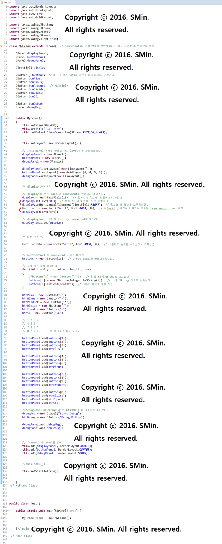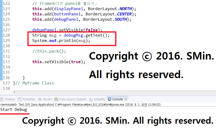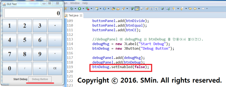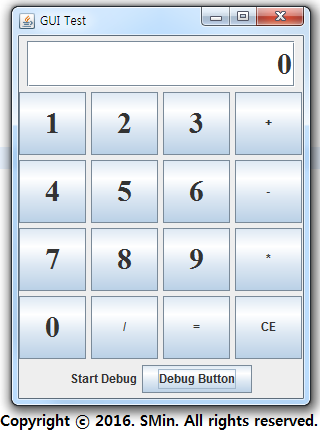 01. 계산기 GUI창 하단에 디버그 하는곳은 안보이도록 'debugPanel.setVisivle(false);' 로 안보이게 가려준다.