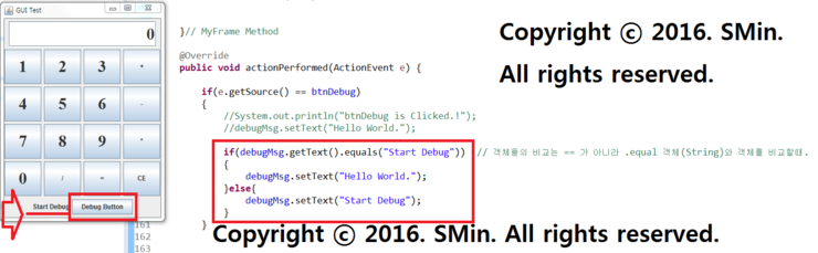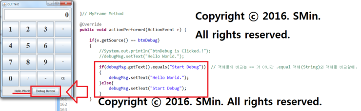 if(debugMsg.getText().equals("Start Debug")) // 객체들의 비교는 == 가 아니라 .equal 객체(String)와 객체를 비교할때.