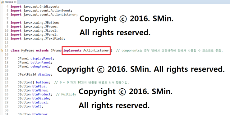 class MyFrame extends JFrame implements ActionListener { // components는 전부 밖에서 선언해줘야 안에서 사용할 수 있으므로 좋음.