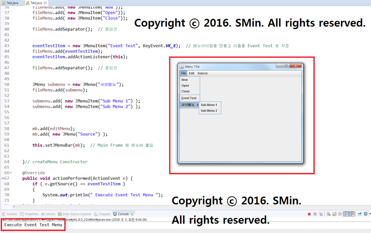 03. 키보드 'e' 를 누르면 Event Test 메뉴아이템이 눌리도록 KeyEvent를 설정하고 확인할 수 있다.