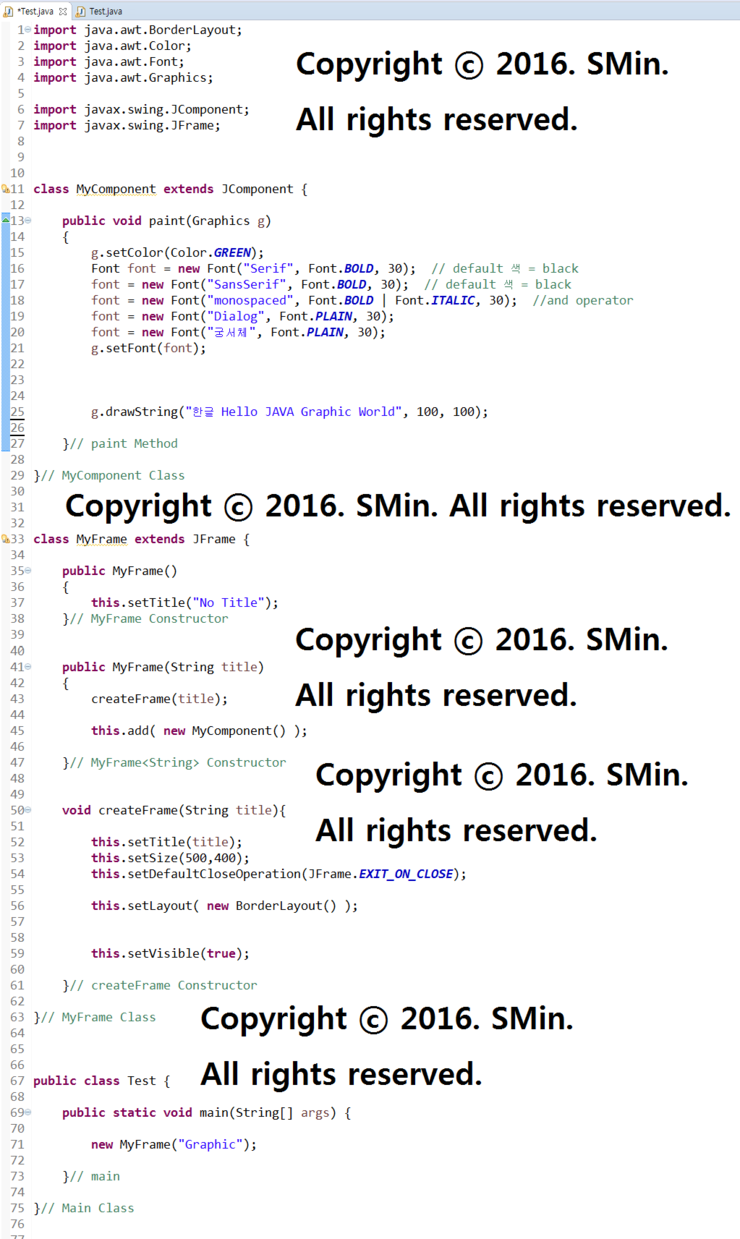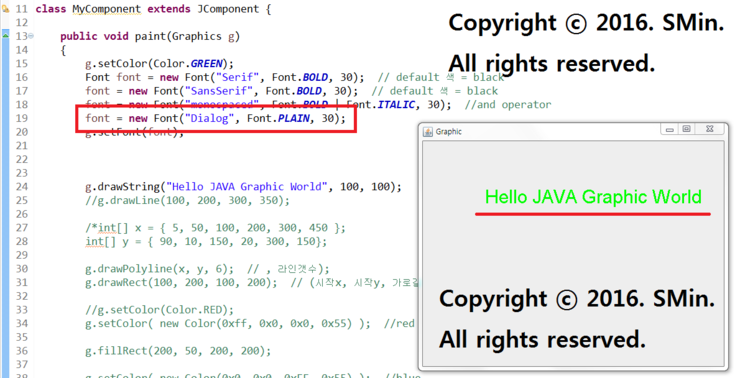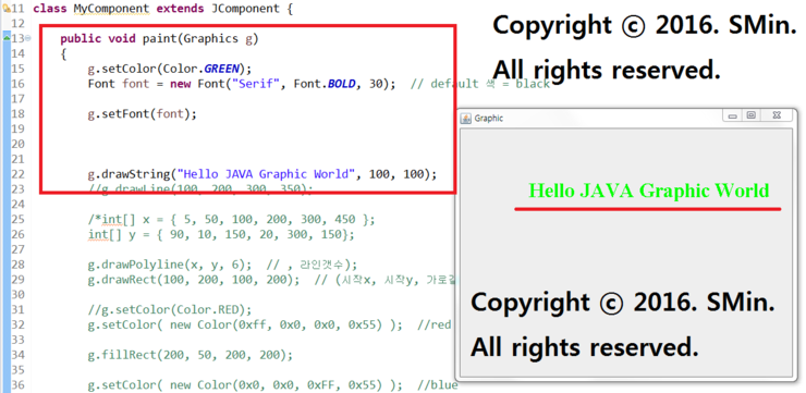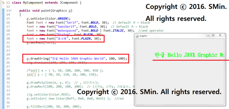 g.drawString("한글 Hello JAVA Graphic World", 100, 100);