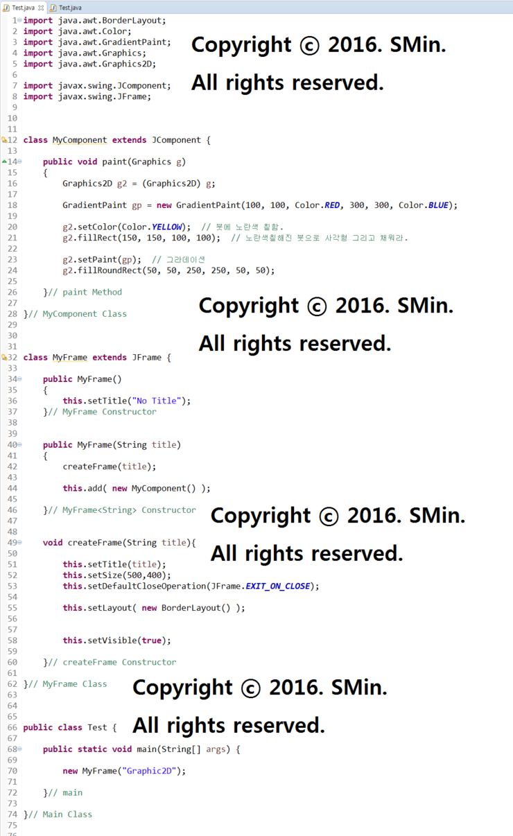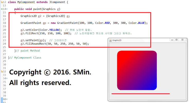 GUI창에서 Graphics2D 중 GradientPaint(그라데이션(Gradation)) 사용방법임.