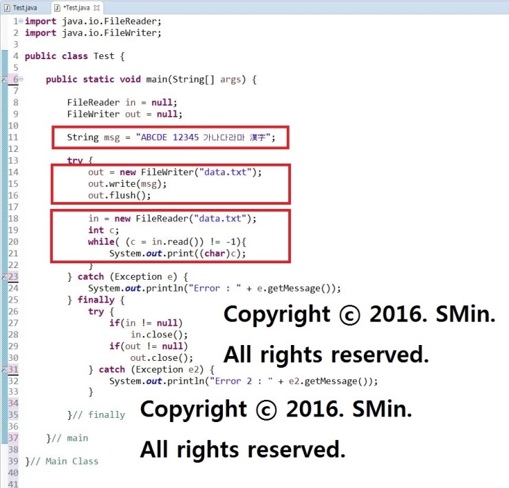 00. msg 변수의 String 값을 넣어주고 FileWriter 와 FileReader 객체를 만들어서 사용.