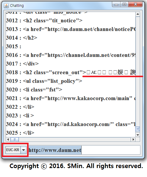 04. 'EUC-KR' 로 했을때 한글이 깨져서 오는것을 확인할 수 있다.