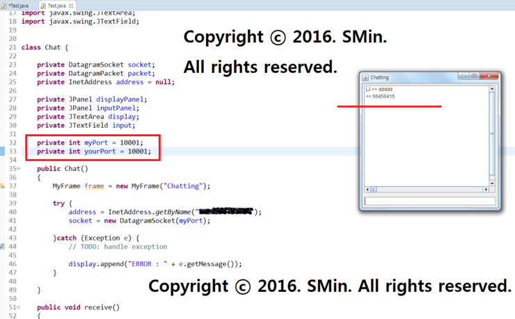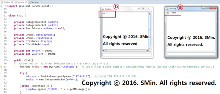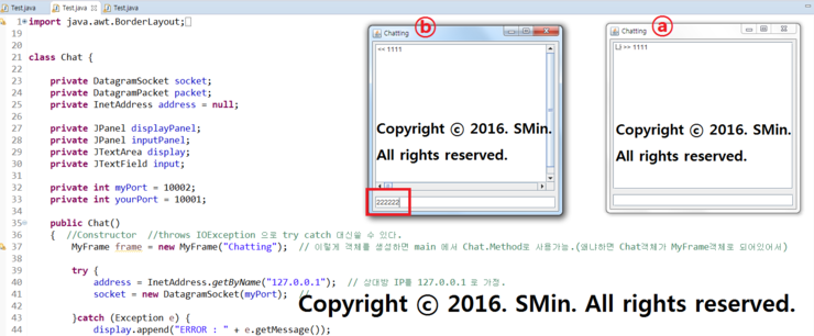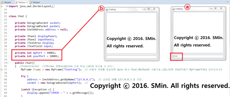 그러면 두 채팅창의 포트번호가 엊갈리게 되므로 통신가능하게 된다.