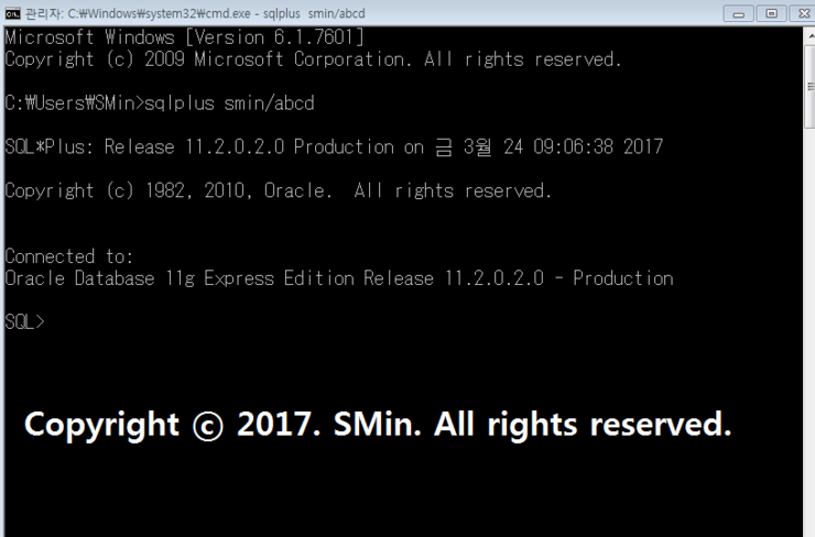 00. cmd를 켜서 sqlplus smin/abcd 로 접속하여 OracleXE를 실행시키자.