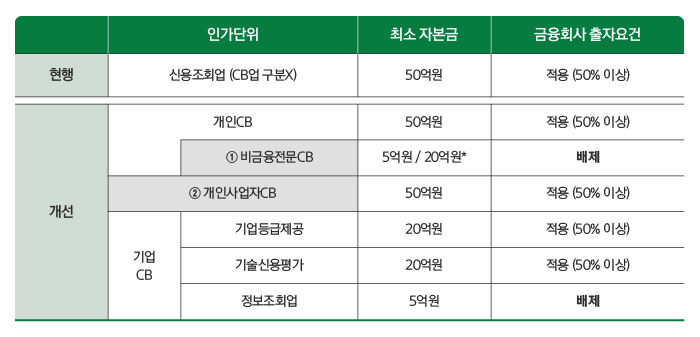 ㅇ 신용정보 관련 산업의 규제체계 선진화 - 신용조회업(CB:Credit Bureau)업을 개인CB, 개인사업자CB, 기업CB 등으로 구분 및 진입규제 요건의 합리적 완화