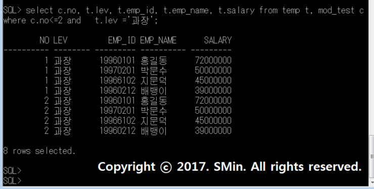 Q. TEMP 에 있는 자료중 직급이 '과장' 인 직원을 읽어 오는데 결과가 실제 데이터베이스에 있는 내용이 두번 중복되어 나오게 해보자. 한번은 인덱스가 1, 나머지한번은 2로 나타내게 하며, '사번', '성명', 'SALARY' 컬럼을 나타내자. (HINT.!! TEMP 와 MOD_TEST 테이블을 카르테시안곱 하면 된다.)