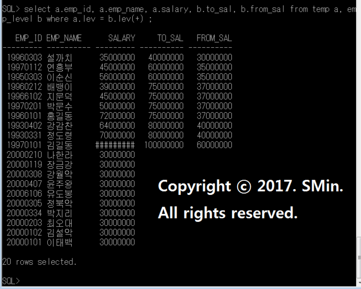 1. 각 사번의 성명, 이름, SALARY, 연봉하한금액, 연봉상한금액을 보고자한다.