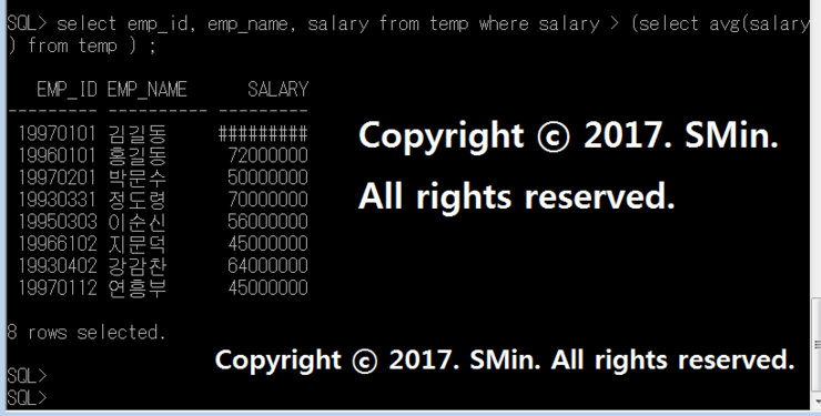 Q. TEMP 테이블을 이용해서 SALARY 의 평균을 구하고 이보다 큰 금액을 SALARY로 받는 직원의 사번과, 성명, 연봉을 나타내어라.