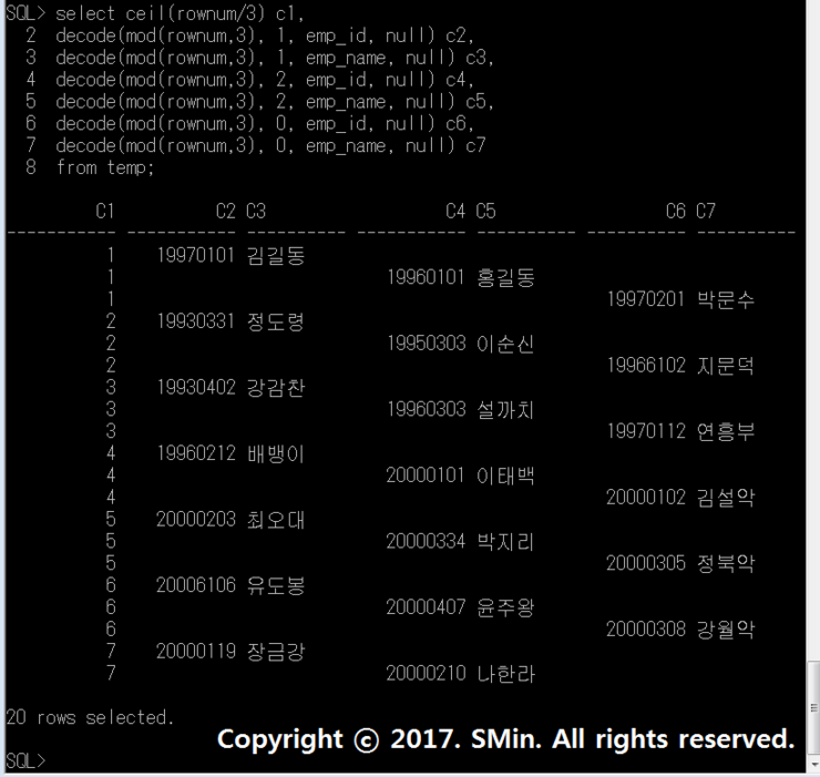 Q. TEMP 테이블에서 행을 3개씩 묶어 하나의 번호를 부여하고, 해당 ROWNUM을 3으로 나눈 나머지가 1, 2, 0 인 경우로 나누어 컬럼의 위치를 정해주자.