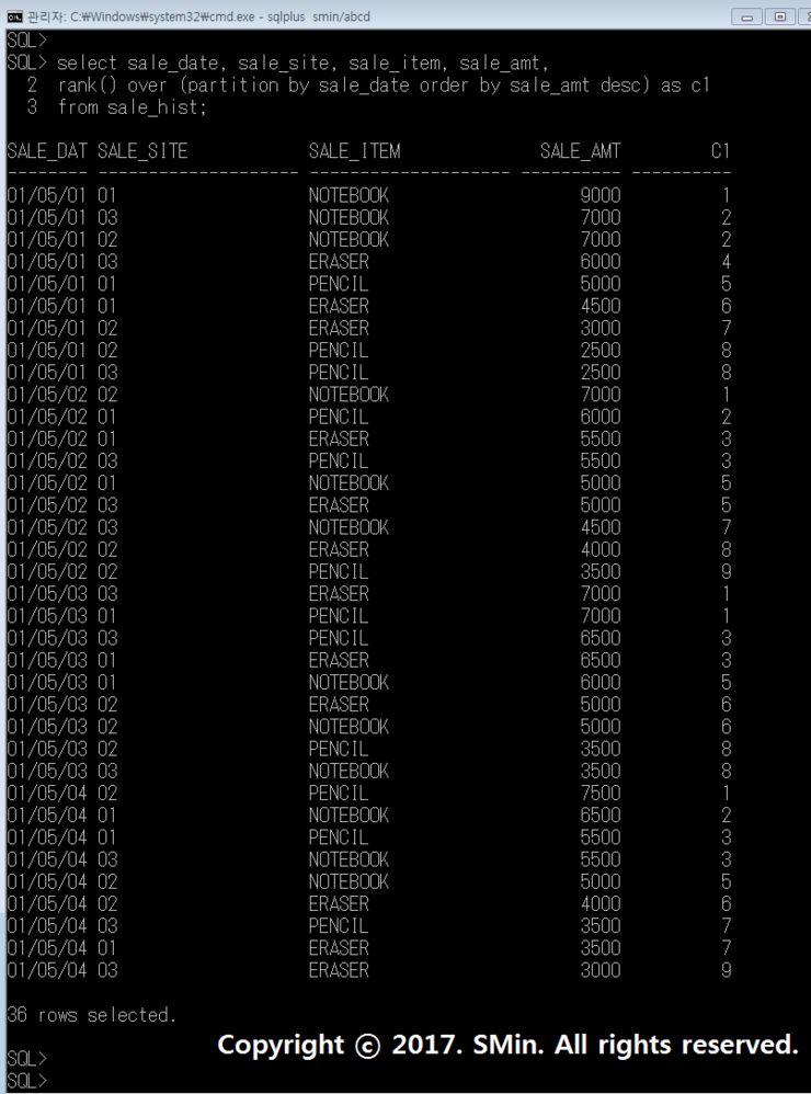 Q. SALE_HIST 테이블을 이용하여 일자별 매출순위와 순위별 사업장, 품목을 나타내어라.