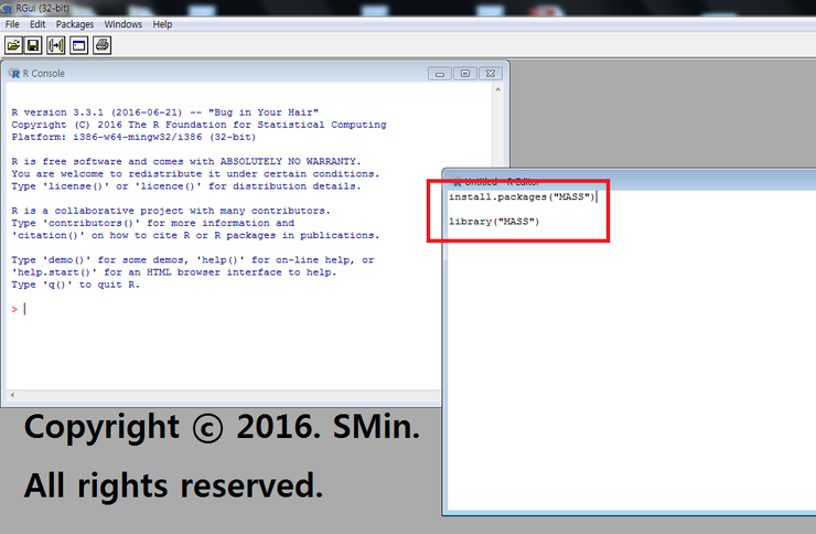 01. 'install.packages("MASS")' 와 library("MASS") 를 작동시키기 위해선 단축키 F5 를 눌러주면 Line별로 실행된다.