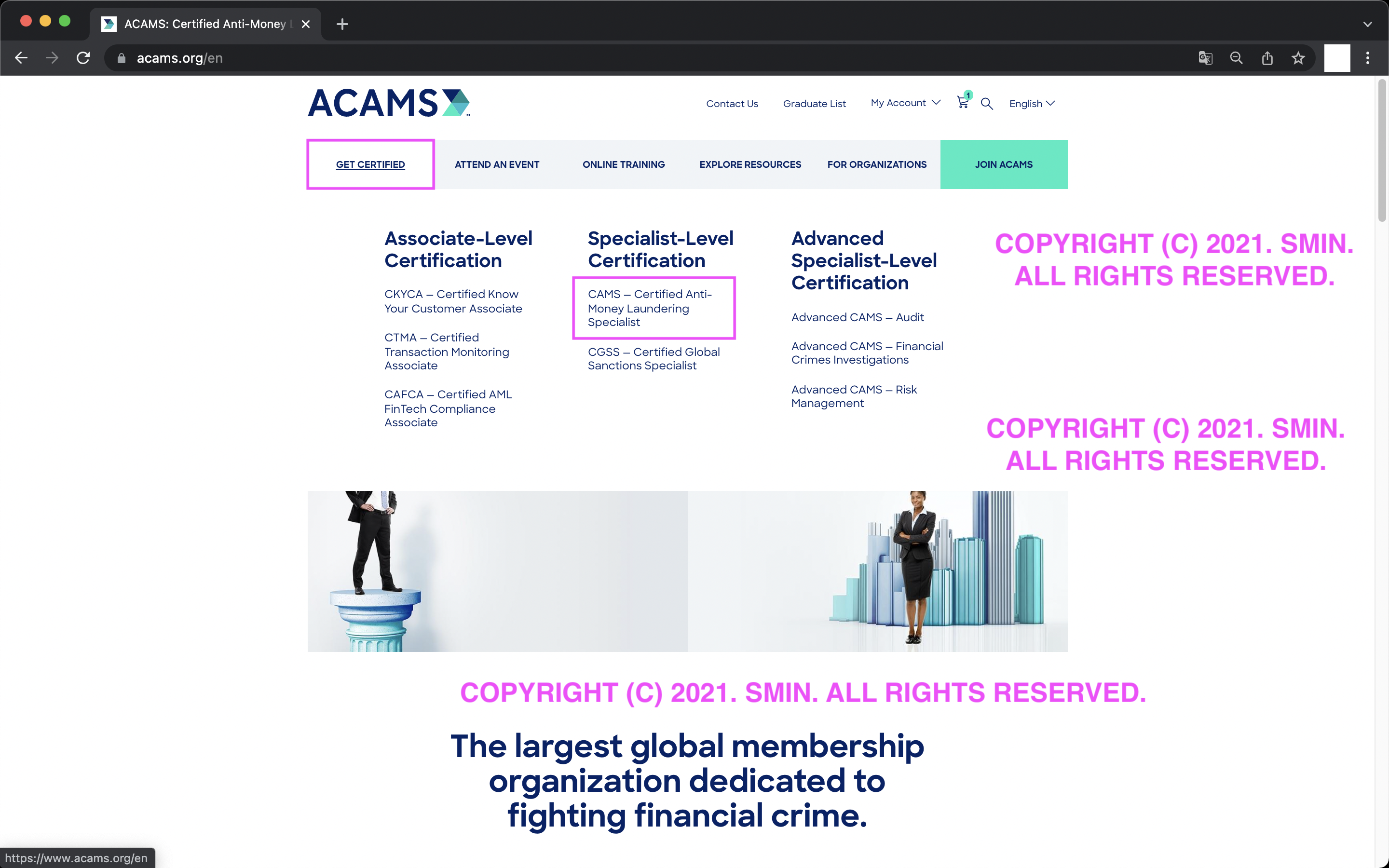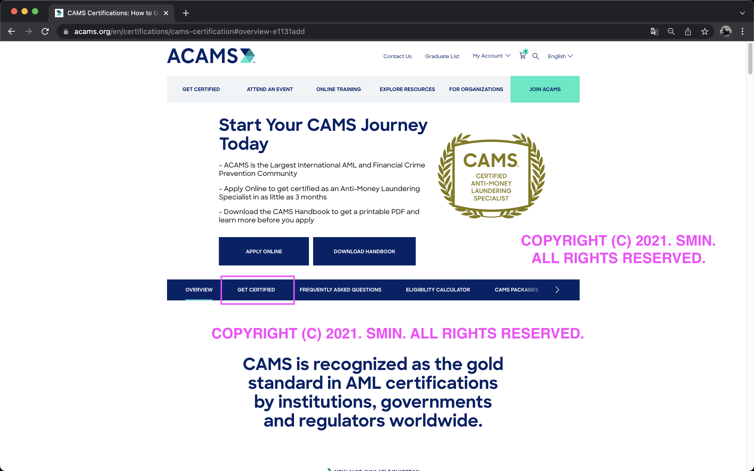 2. 'GET CERTIFIED' -> 'CAMS-Certified Anti-Money Laundering Specialist' 클릭