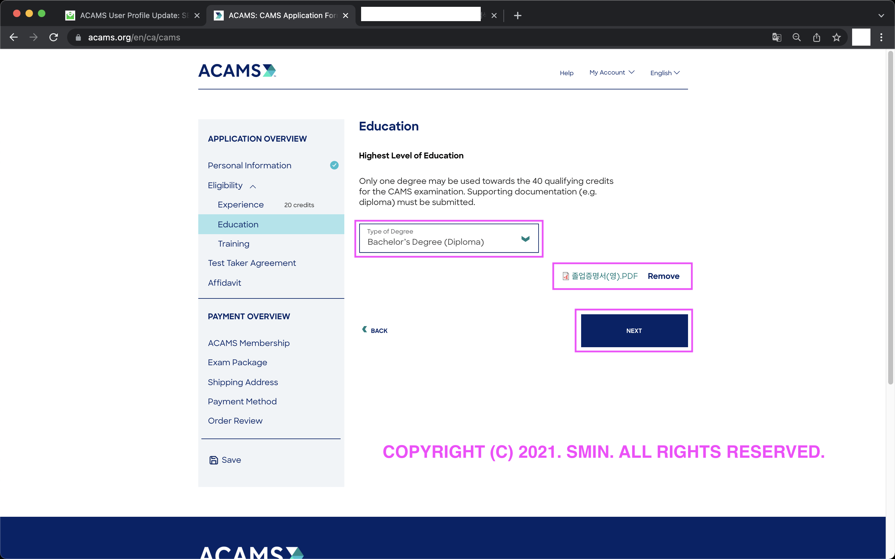 7. 학력정보 입력 -> 영문졸업서 첨부 -> 'NEXT' 클릭