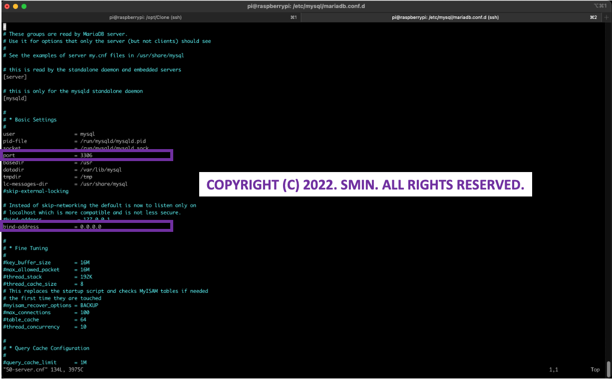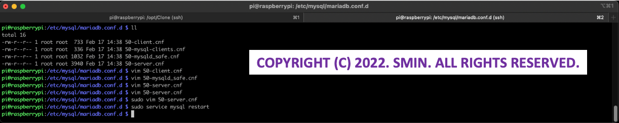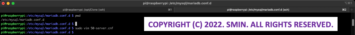 1. 라즈베리파이는 타 OS들과 달리 mysql config 가 위치도 다르고 파일명도 다르다