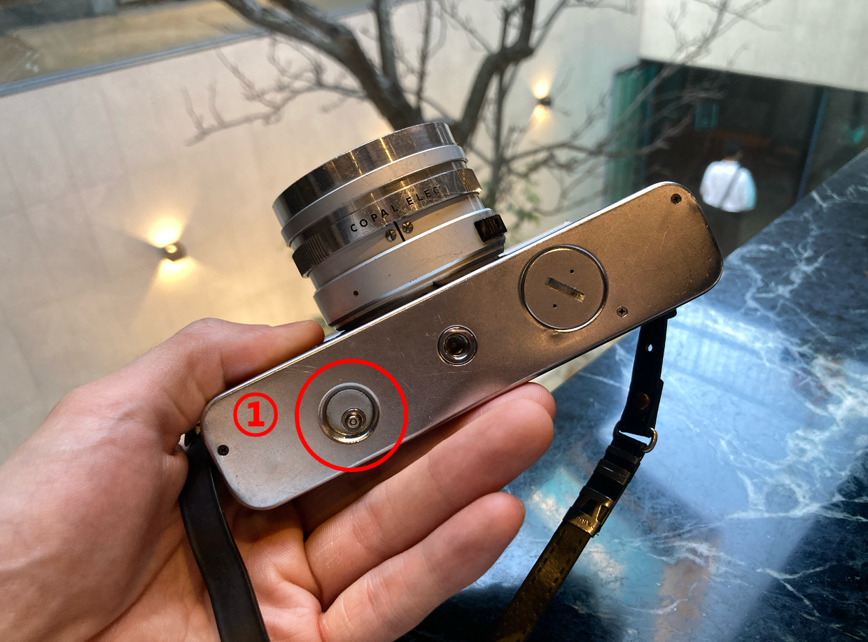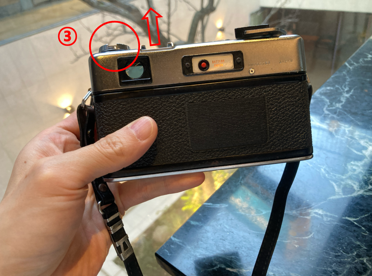 2. 카메라 위쪽 왼쪽에 리와인딩 레버를 시계방향으로 돌려서 필름을 다 감아줍니다.