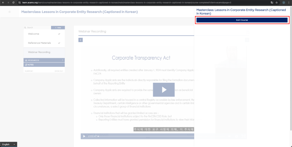 9. 종료되면 다음버튼을 클릭하여 "Exit Course"로 나가면 된다.