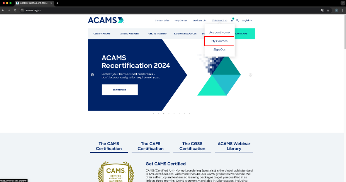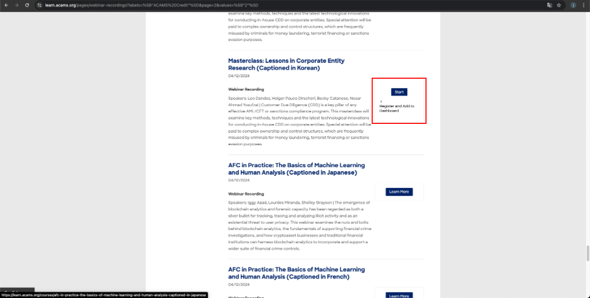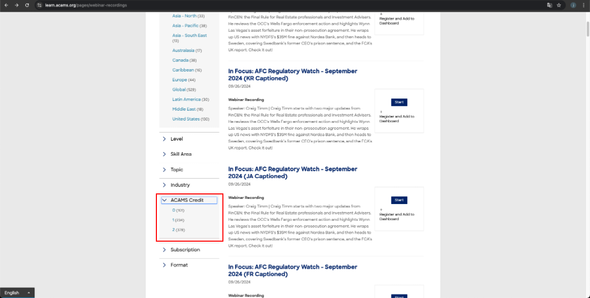 4. 스크롤을 내려 아래쪽에 "ACAMS Credit" 이라는 항목을 열어서 원하는 크래딧을 누른다.