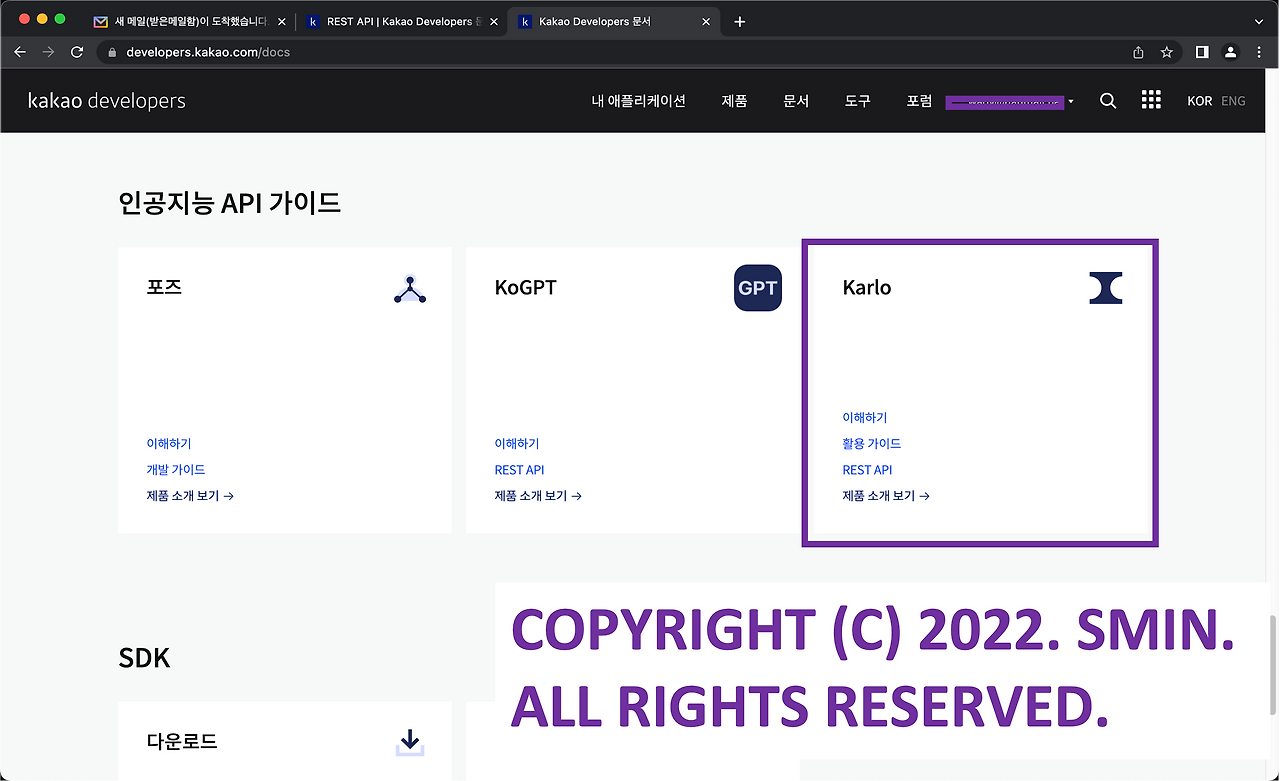 3. 아래쪽으로 내려서 '인공지능API 가이드' 부분에 KARLO를 누른다.