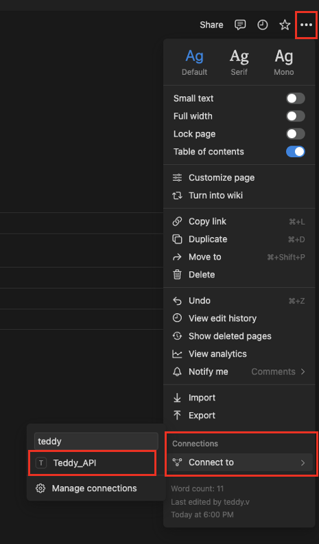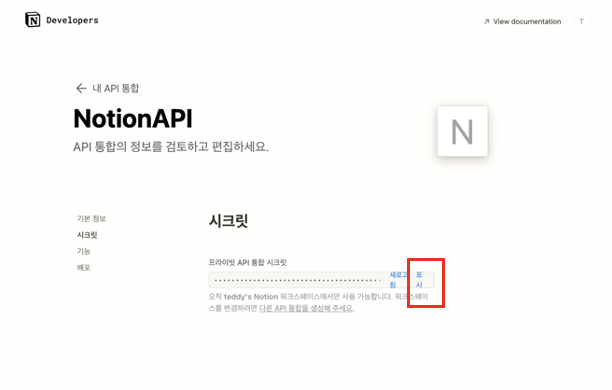 3-1. 데이터베이스 생성한 페이지 우측상단에 더보기(…) 를 클릭하여 API를 연동한다.