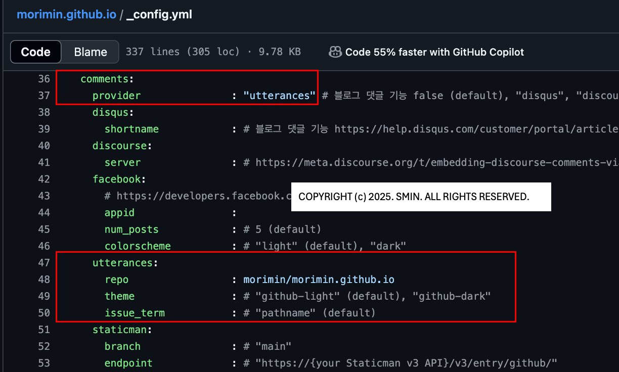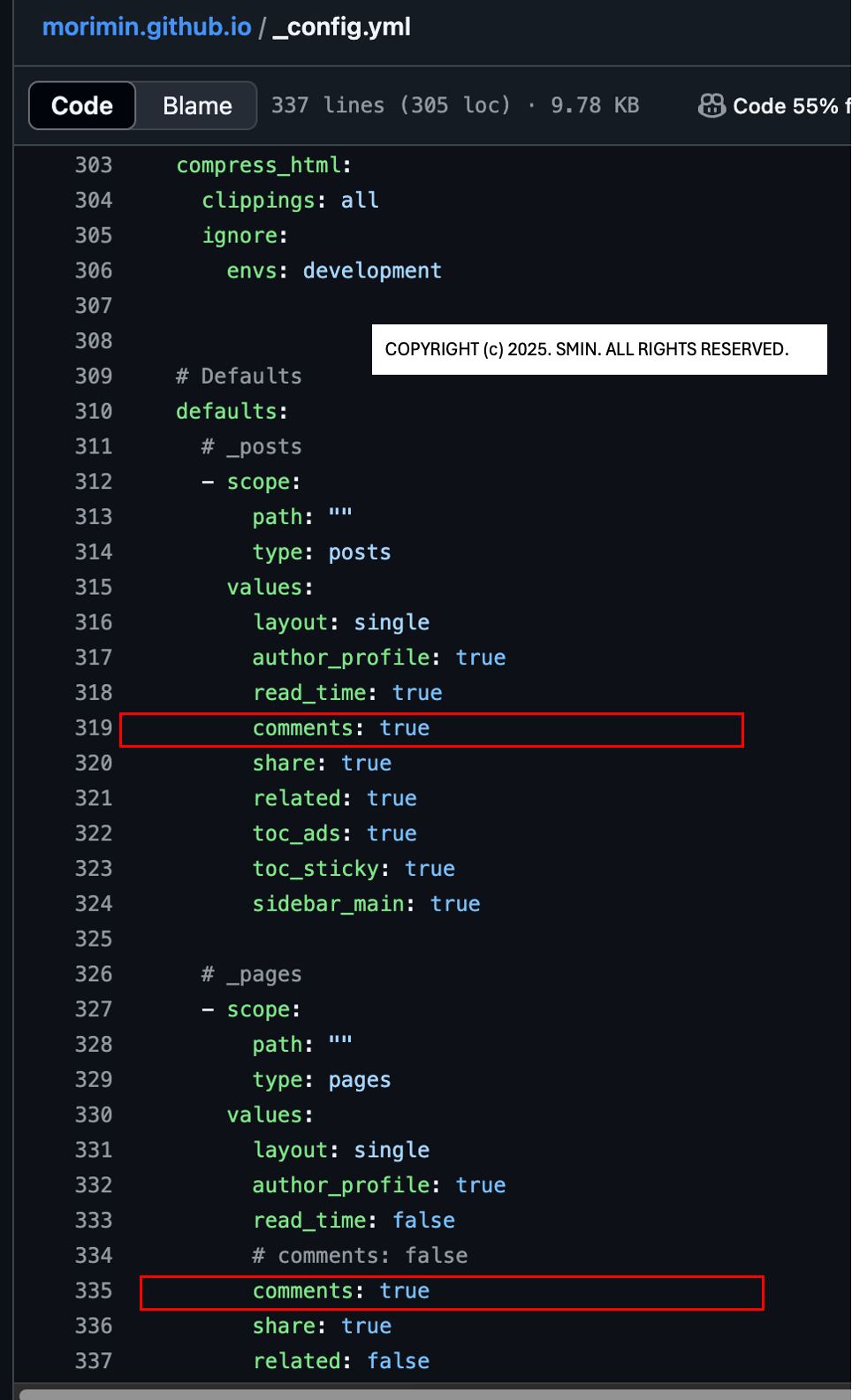 4. _config.yml 파일 하단에 comments 부분 true 로 바꿔줘야한다.