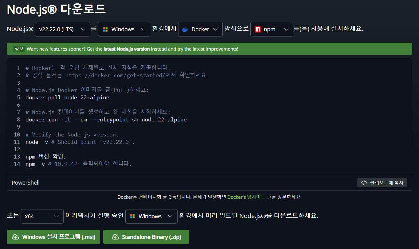 (1) Node.js 설치 -> 웹페이지에서 22.22 LITE버전을 다운받아서 설치