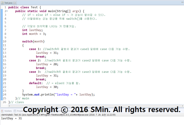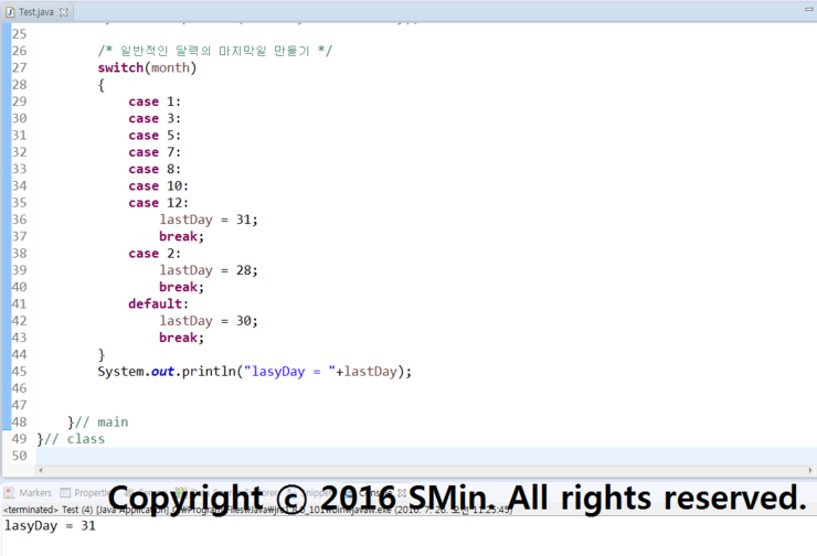 00. 3월을 입력하고 switch문을 다음과 같이 작성하면 case 3 으로 작동되서 31이 출력된다.