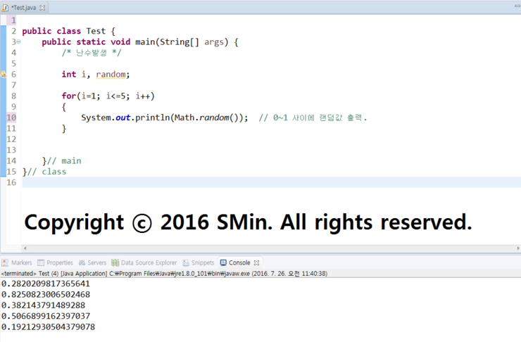 0~1사이의 수가 나오므로 int 타입으로 Casting 시켜서 정수값이 나오게 하는것이 편하다.