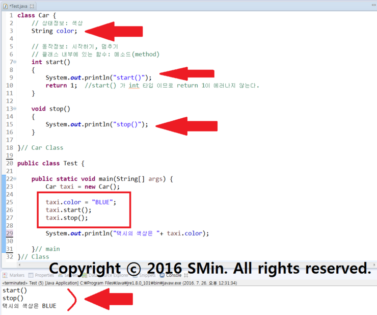00. 먼저 Car라는 클래스를 다음와 같이 만든다. 상태정보(변수) 와 동작정보(메소드)를 포함시킨다.