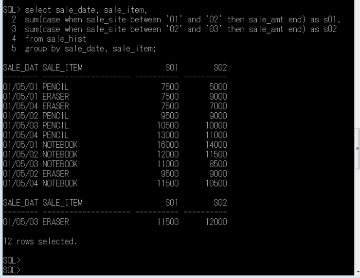 Q. SALE_HIST 테이블을 이용하여 일자별 품목별로 '01', '02' 사업장 판매 금액합, '02', '03' 사업장 판매 금액합을 구하라