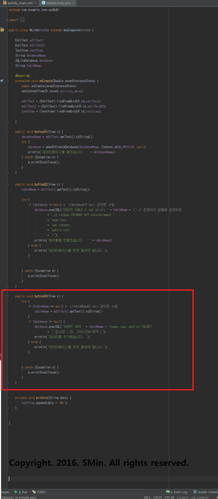 database.execSQL("CREATE TABLE if not exists " + tableName + "(" // 존재하지 않을때 생성하라