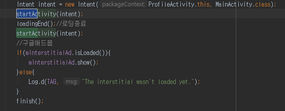난 버튼을 누르면 전면광고가 띄워지게끔 구현을 하였다. 확인 버튼을 누르면 다른 액티비티로 넘어가는데 finish전에 다음과 같은 코드들을 넣어주면된다.