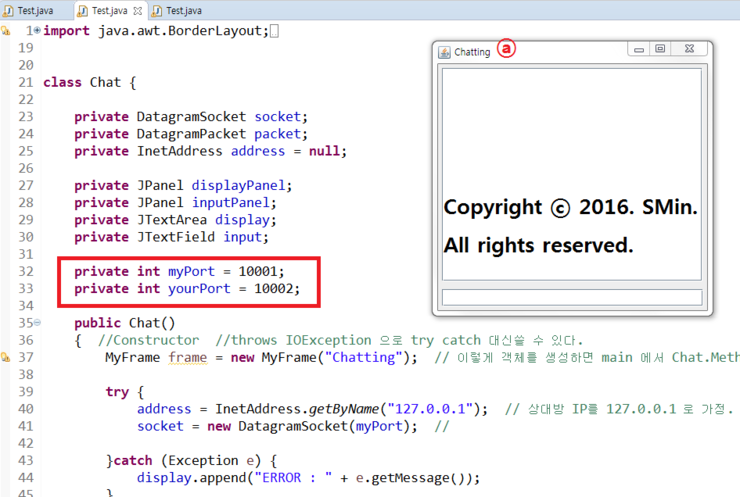 그러면 두 채팅창의 포트번호가 엊갈리게 되므로 통신가능하게 된다.