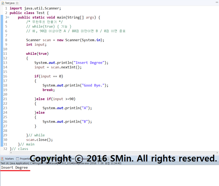 01_3. 90을 입력하자 A값이라고 출력되고 역시 다시 성적값을 입력하라는 메시지를 볼 수 있다.