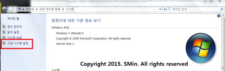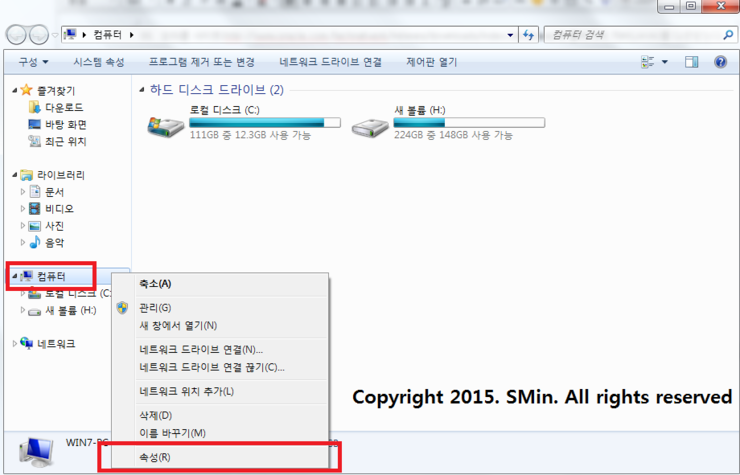 07. 다시한번 바탕화면-컴퓨터 아이콘 클릭 + 왼쪽에 컴퓨터아이콘에서 마우스 오른쪽버튼 클릭 + 속성 탭 클릭