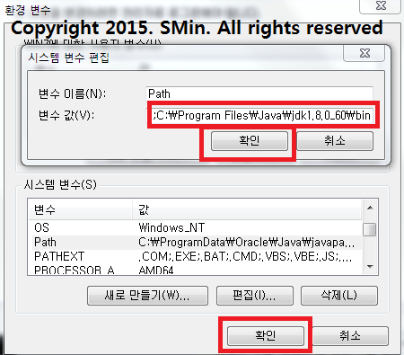 변수 값: C:\Program Files\Java\jdk1.8.0_60 (bin 폴더 들어가기 전까지만 적어주면 된다.)