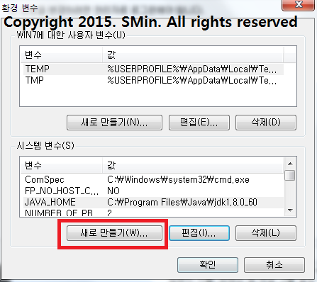 10. 아래쪽(시스템변수)에 있는 새로만들기 클릭.