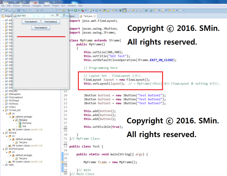 this.setLayout(layout); // = MyFrame(=this) 에다 FlowLayout 을 setting 하겠다.