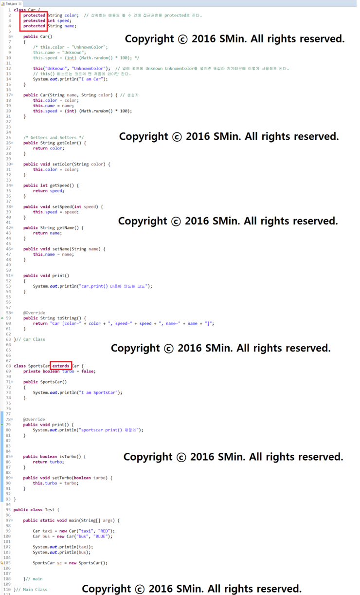 protected String color; // 상속받는 애들도 볼 수 있게 접근권한을 protected로 준다.
